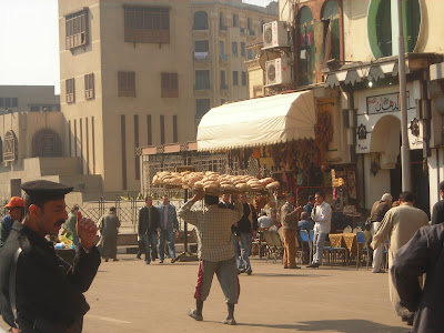 The weather was like spring today. The sweater-sporting Egyptians might not say that, but, as I rode back to Zamalek this afternoon in the duct-taped back seat of a cab, I could see the blue sky and smell something...fresh? I walked to Metro, the Western-style grocery store located in the basement of an otherwise dilapidated mall. On the way, I said hi to a bawaab who perpetually parks it in a chair in front of his building. A woman in an abaya was walking in the street. Her companion was a toddler in a torn green sweater who appeared to be too far from her grasp. The boy swerved in front of a car, which slowed before it could hit him. The woman chastised the boy and yanked him closer, then promptly let him go as another string of cars passed.